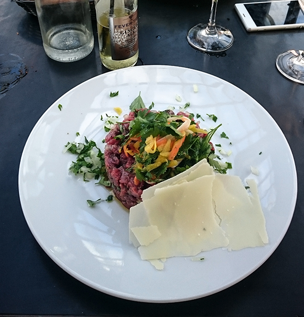 Habituellement, je ne suis pas fan de tartare, mais je me suis laissée tenter par celui de bœuf Simmental coupé au couteau et préparé à l’italienne (avec des olives noires, des câpres et du parmesan), et je pense que c’est la première fois que j’ai réussi à finir mon plat ! Un délice, une viande qui fond dans la bouche et des saveurs délicates, très différentes des tartares que l’on trouve habituellement en France. Monsieur a quant à lui dégusté un fish n chips simple et très bien exécuté avec sauce tartare maison. Inutile de préciser que les frites étaient délicieuses.